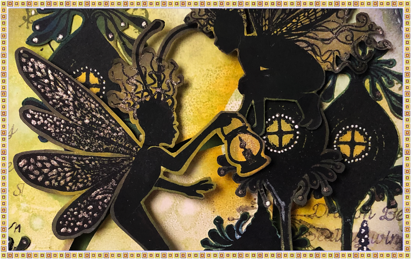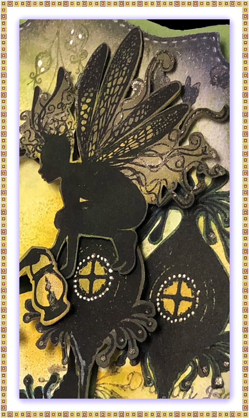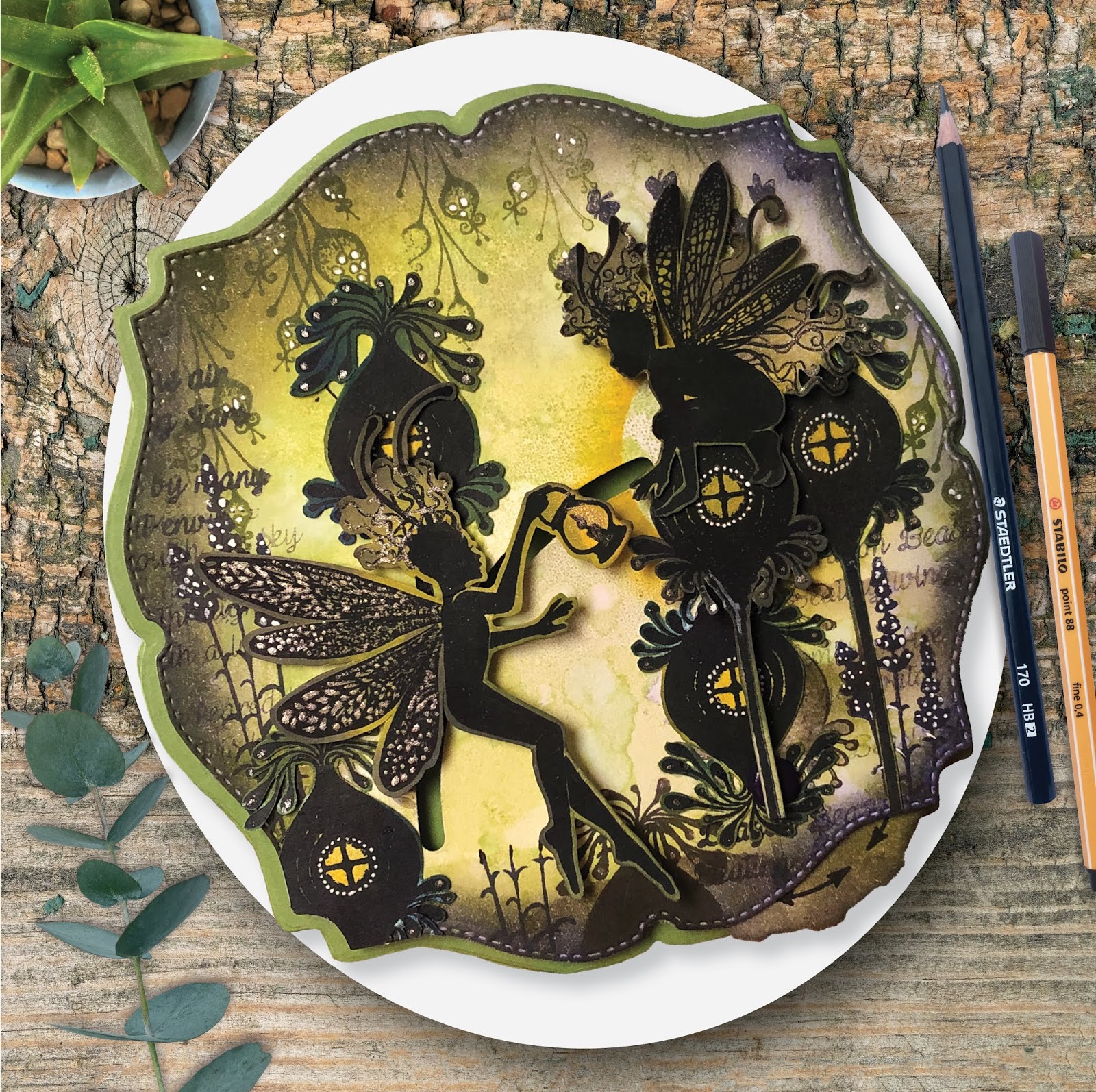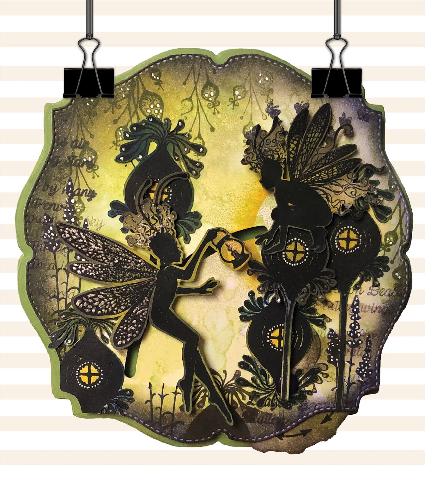 I've created another project with my Double Dial Die today. This time the Lavinia Stamps Fairies are sharing the light. Tonight the Dragonfly Keeper is spreading the light dust to Oona's pod. Her pod is rising up to receive the light while it leaps over to her.
