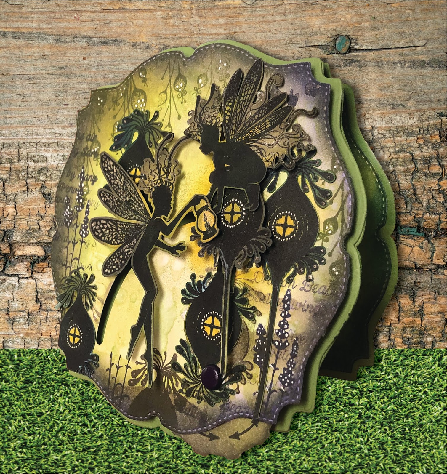 I've used my Gelli Plate to create the background with Color Box ink and Brusho's. I stamped some of the pods, foliage, words and fairies in Versa Clair Nocturn and Shady Lane ink and used a template of the slots from the Double Dial Die and hand cut the slots into the face of the card built on one of my previous die sets. I fussy cut some of the pods and the fairies and assembled the kinetic portion of the card.