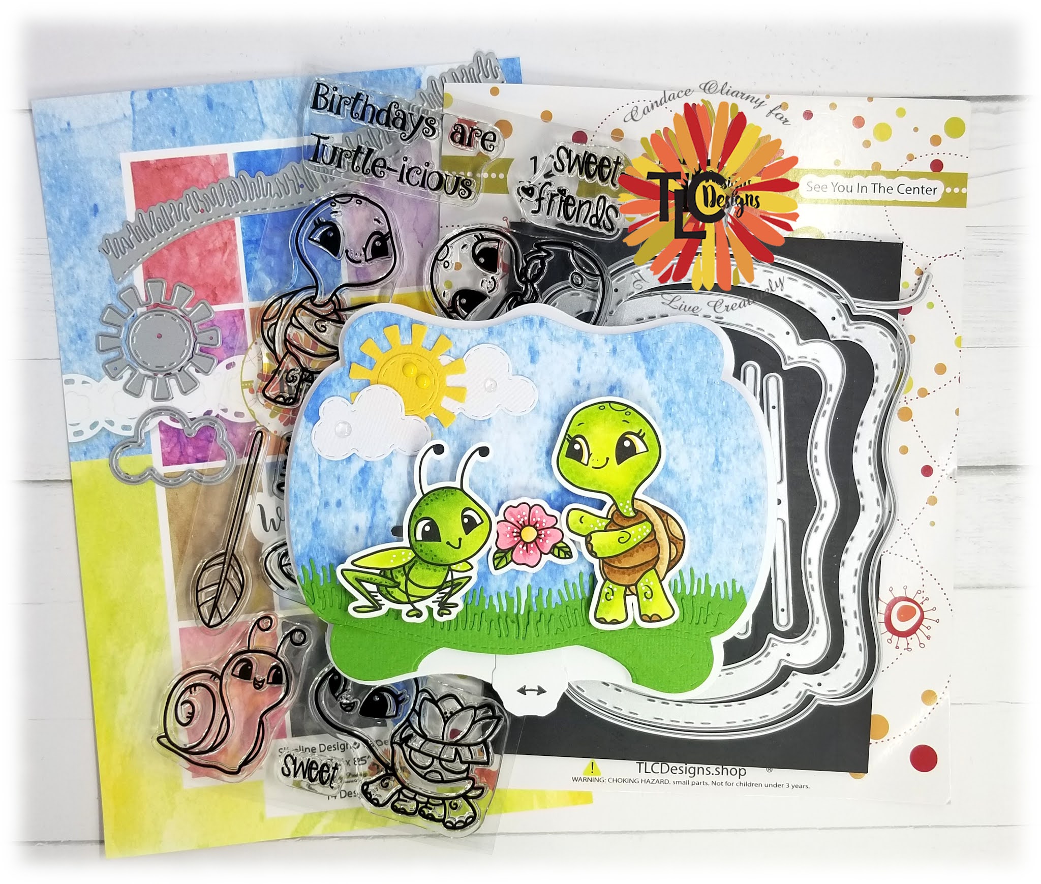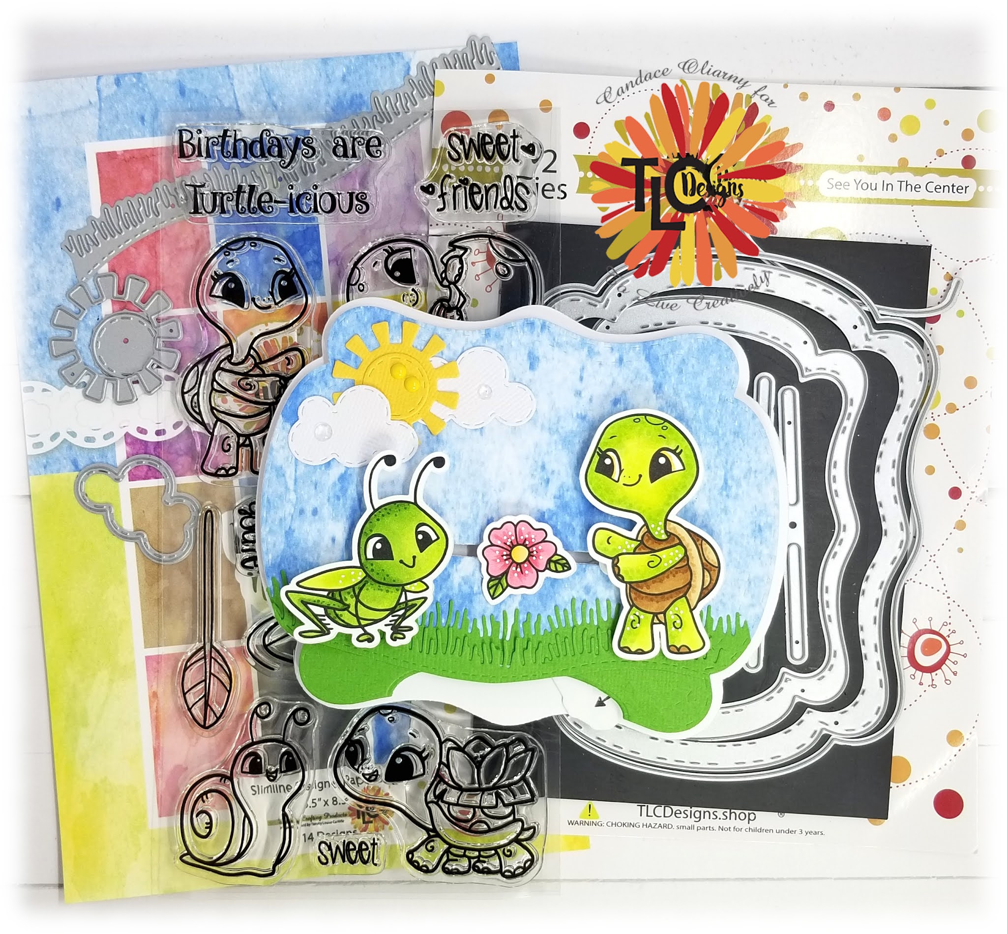I started out with the Watercolor Naturals Paper which I used the mat die cut from See you in the Center and pieced all dies together to make this interactive card. I used the grass die from Land and Sea Dies with green cardstock and then used the mat die again to have the grass sit on the bottom of the base. I cut out clouds and the sun from Aztec Sunshine Die and glued on top of card to create a scene. I cut out and colored up the turtle and flower from Turtle-isious and the cricket from Troll Cricket Fun. Once all colored I attached the cricket and turtle with pop dots to the washers on the front so they can move back and forth on the card. To hide the brad in the middle, I glued the flower to it. Such a fun interactive card!!