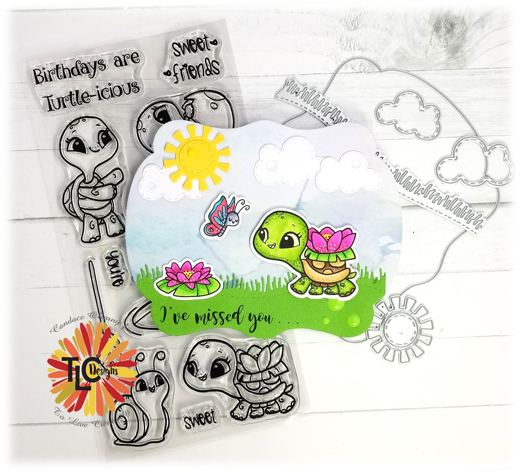 I started out with the Watercolor Naturals Paper which I used the frame die cut from See you in the Center to create the base of my card. I used the grass die from Land and Sea Dies with green cardstock and then used the frame die again to have the grass sit on the bottom of the base. I cut out 3 clouds and the sun from Aztec Sunshine Die and glued across the top of the base. I cut out and colored up the turtle and lily flower from Turtle-isious and the butterfly from Alicorn Happiness and placed them on the card base to create this card scene. I cut out a 4 x 3.75 card which I glued to the back of the base to make a card. The turtles are my favorite!!!